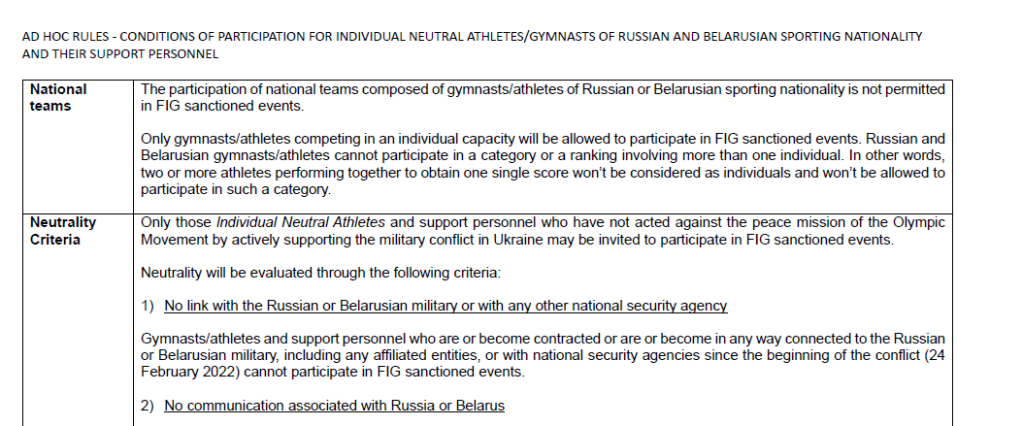 Unter der Überschrift „National Teams“ hieß es in der vorher gültigen Fassung vom 12. Dezember 2023: „Die Teilnahme von Nationalmannschaften, die aus Turner*innen/Athlet*innen russischer oder belarussischer Staatsangehörigkeit bestehen, ist bei von der FIG sanktionierten Veranstaltungen nicht gestattet. (…) Russische und belarussische Turner*innen/Athlet*innen dürfen nicht in einer Kategorie oder einem Ranking teilnehmen, an dem mehr als eine Person beteiligt ist.“