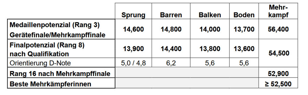 Jesenia Schäfer, die bei beiden Qualifikationen im Mehrkampf Platz zwei belegte, lag mit 50,200 Punkten über zwei Punkte von der als für Platz 16 im Mehrkampf angegebenen Zielmarke von 52,900 entfernt. Schäfer, die erst nach Abschluss der WM 16 Jahre alt wird, hat in ihrem ersten Jahr als Seniorin bisher beeindruckt. Silja Stöhr erturnte bei der ersten Qualifikation 51,300, bei der zweiten erwischte sie einen ganz schlechten Tag mit mehreren Stürzen (48,050). Im Gegensatz zur Olympiaqualifikation 2024, wo die vorgegebenen Punkte als harte Grenze für die Vergabe des Einzelplatzes galten, dienen die Punkte 2025 eher der Orientierung. „Wenn es eine kleine Abweichung gibt, werden wir nicht superstreng sein“, erläuterte Wiersma nach dem Wettkampf in Saarbrücken.